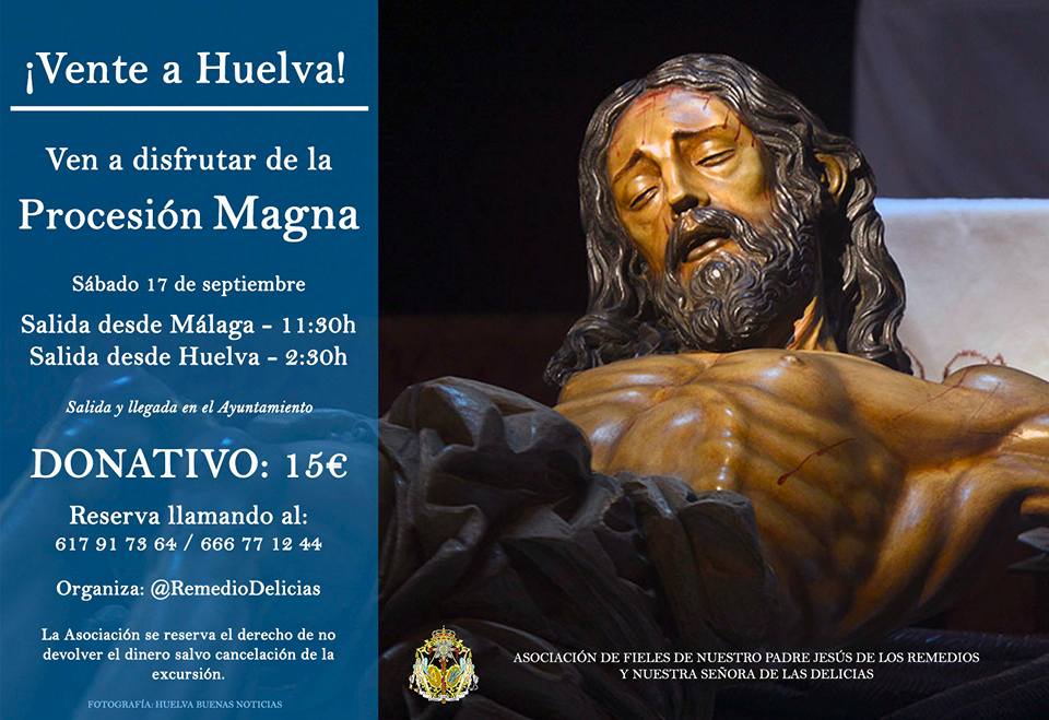 La Asociación de Fieles de Nuestro padre Jesús de los Remedios y Nuestra Señora de las Delicias de Málaga, organiza excursión a la Procesión Magna de Huelva que tendrá lugar el próximo sábado 17 de Septiembre.