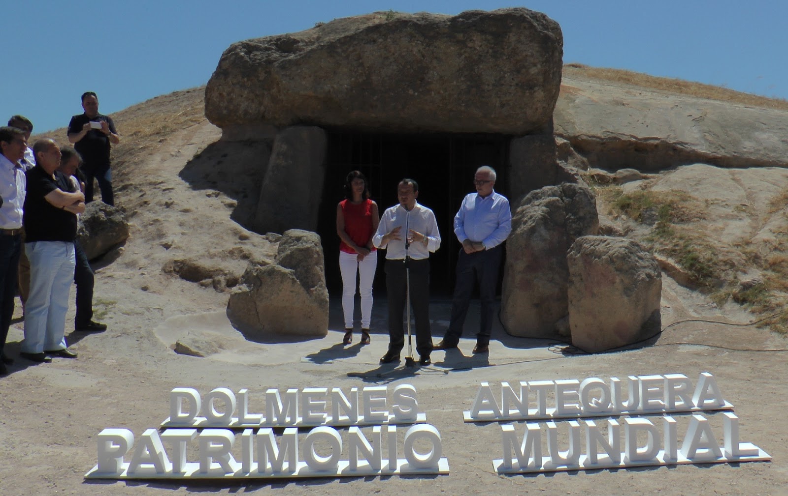 Además, del delegado territorial de la Junta, también estuvieron presenten en el Conjunto Arqueológico varios responsables de la Administración autonómica, que tras la declaración quisieron realizar la primera visita oficial al dolmen de Menga, ya como Patrimonio Mundial, en el acto que tuvo lugar a la entrada del megalito. En el que recordó que el trabajo del Gobierno regional continuará en este espacio en «tres líneas fundamentales: conservación, investigación y promoción y difusión”.