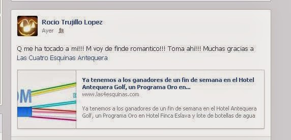 Rocío Trujillo López nos publicaba y nos daba las gracias por haber sido la afortunada de un fin de semana romántico con su pareja en el Hotel Antequera Golf que sorteábamos, la suerte estuvo de su lado y desde nuestro equipo deseamos que lo pasen de la mejor forma posible. Enhorabuena!.
