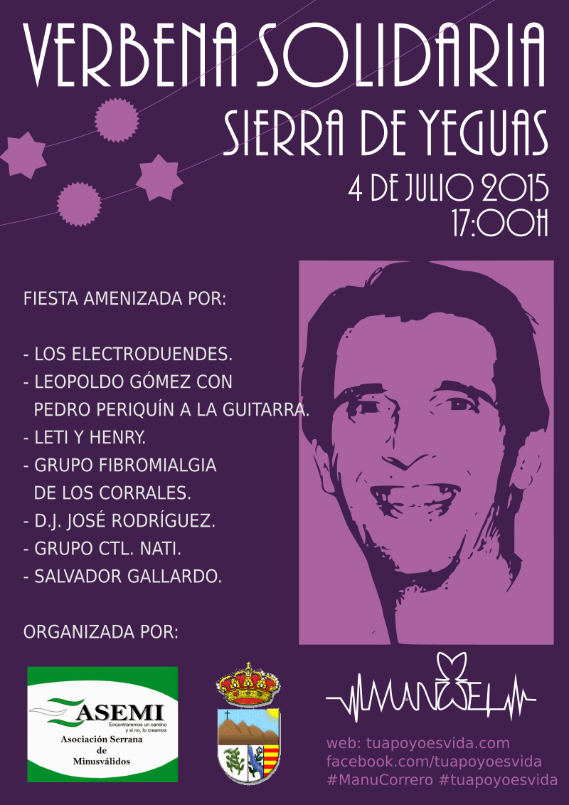La verbena está organizada por ASEMI, la Asociación Serrana de Minusválidos, en colaboración con el Ayuntamiento de Sierra de Yeguas, todo bajo la coordinación de la plataforma ‘Tu apoyo es vida’, creada por y para Manuel Correro.