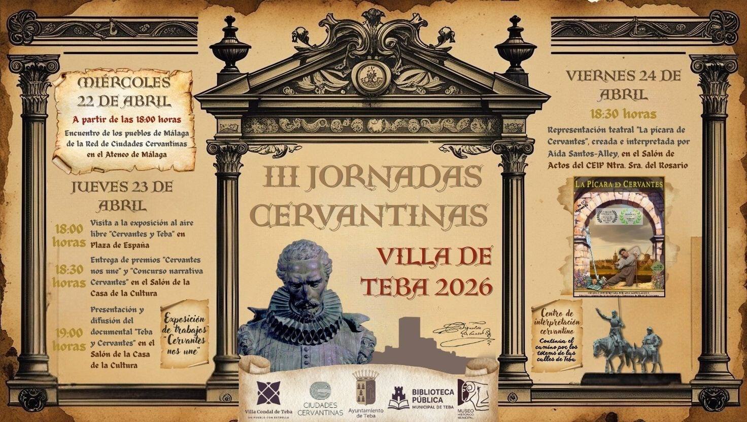 El Ayuntamiento de Teba ha presentado la programación de las III Jornadas Cervantinas – Villa de Teba 2026, una iniciativa que tendrá lugar entre el miércoles 22 y el viernes 24 de abril. El evento propone una serie de actividades dedicadas a la literatura y el legado de Miguel de Cervantes en la localidad.