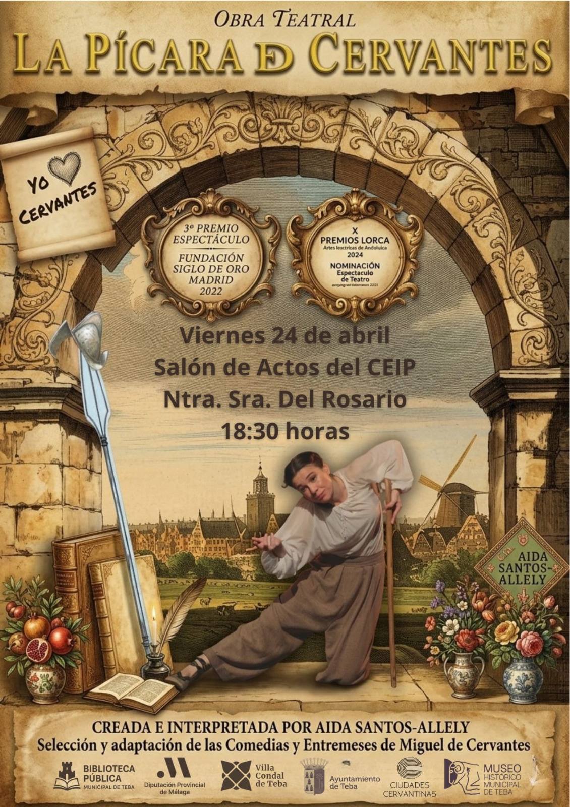 El broche final a las jornadas tendrá lugar el viernes 24 de abril. A las 18:30 horas, el Salón de Actos del CEIP Nuestra Señora del Rosario será el escenario de la representación teatral “La Pícara de Cervantes”, una obra creada e interpretada por la artista Aída Santos-Alley. De forma paralela a los eventos programados, el municipio mantiene abierto su Centro de Interpretación Cervantino.
