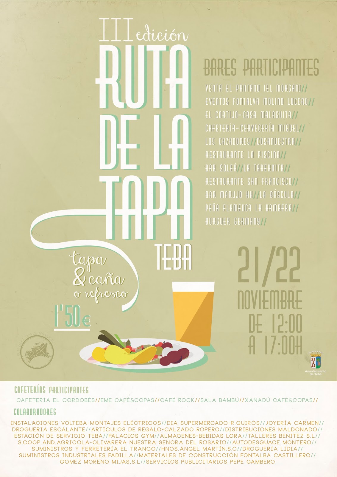 Desde ayer tiene lugar en Teba la tercera edición de La Ruta de la Tapa, consolidándose poco a poco como un evento gastronómico local más en el que poder disfrutar de las propuestas culinarias que ofrecen y presentan los distintos bares y restaurantes locales. En esta tercera edición, son catorce restaurantes los que participan junto con cinco bares y diecinueve negocios de diversa índole que han colaborado.