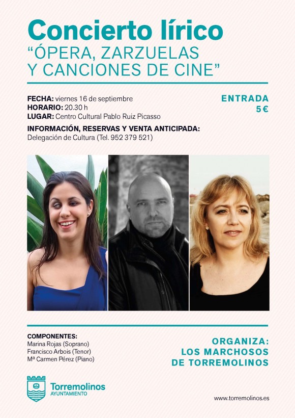El Centro Cultural Pablo Ruiz Picasso acogerá el próximo viernes 16 de septiembre a las 20.30 horas el concierto lírico de ‘Ópera, zarzuelas y canciones de cine’. Los artistas invitados a esta cita cultural serán la soprano Marina Rojas, el tenor Francisco Arbois y Mª Carmen Pérez al piano y está organizado por ‘Los marchosos de Torremolinos’ en colaboración con el ayuntamiento. El evento tendrá un precio de 5 euros y se pueden comprar en la Delegación de Cultura del Ayuntamiento de Torremolinos en el número de teléfono 952 37 95 21.