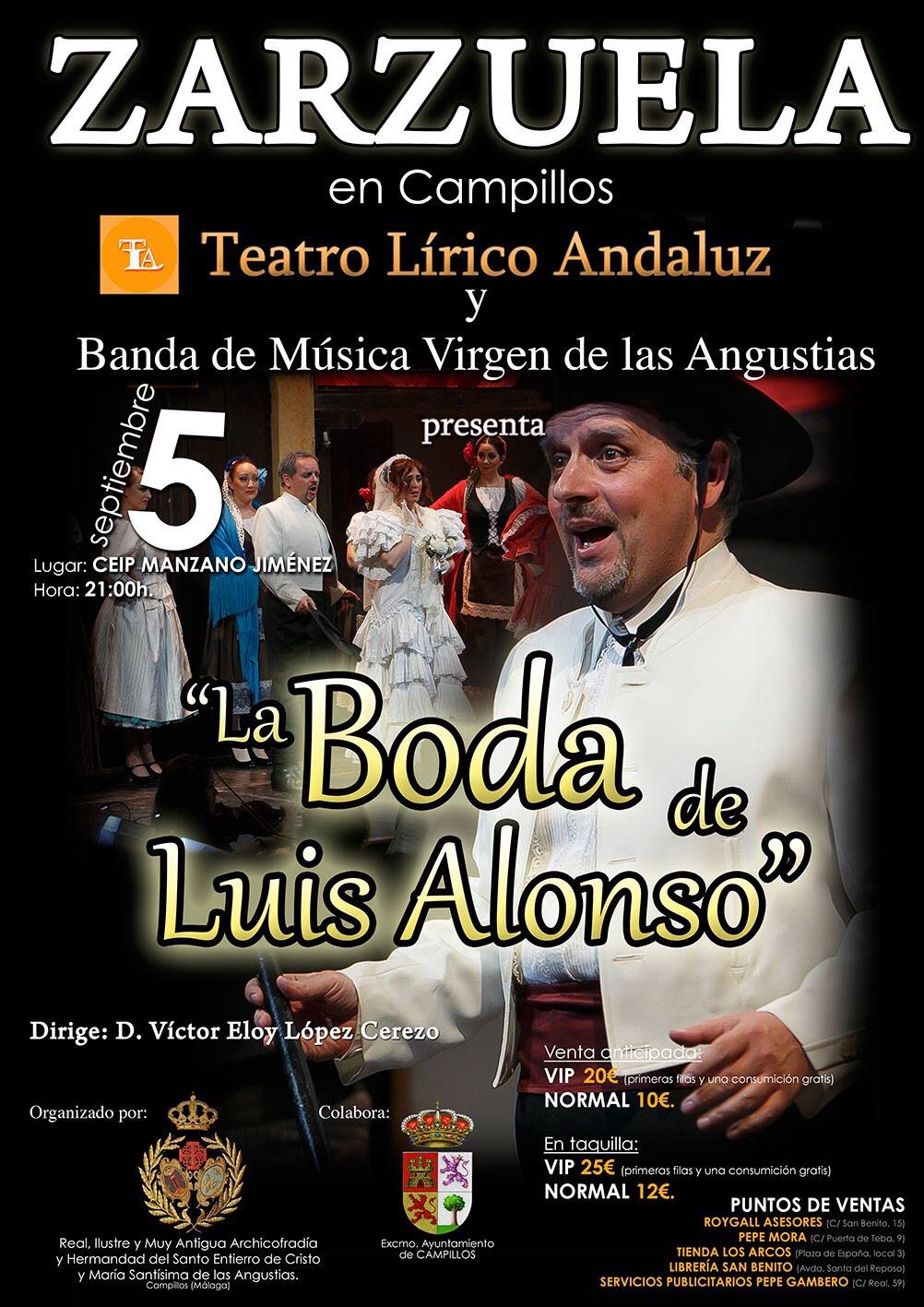 Todavía estás a tiempo de disfrutar de una noche de zarzuela en Campillos. Organizada por la Hermandad del Santo Entierro de Cristo y María Santísima de las Angustias ‘La boda de Luis Alonso’, ésta se interpertará en el C.E.I.P ‘Manzano Jiménez’. Siendo la compañía Teatro Lírico Andaluz la encargada de subirse al escenario.