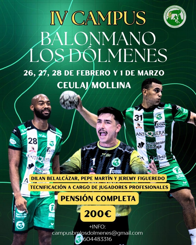 El Club Balonmano Los Dólmenes celebrará los días 26, 27 y 28 de febrero y 1 de marzo la cuarta edición del Campus de Balonmano Los Dólmenes, que se desarrollará en las instalaciones del CEULAJ de Mollina. La actividad está dirigida a jugadores y jugadoras de las categorías Alevín, Infantil y Cadete.
