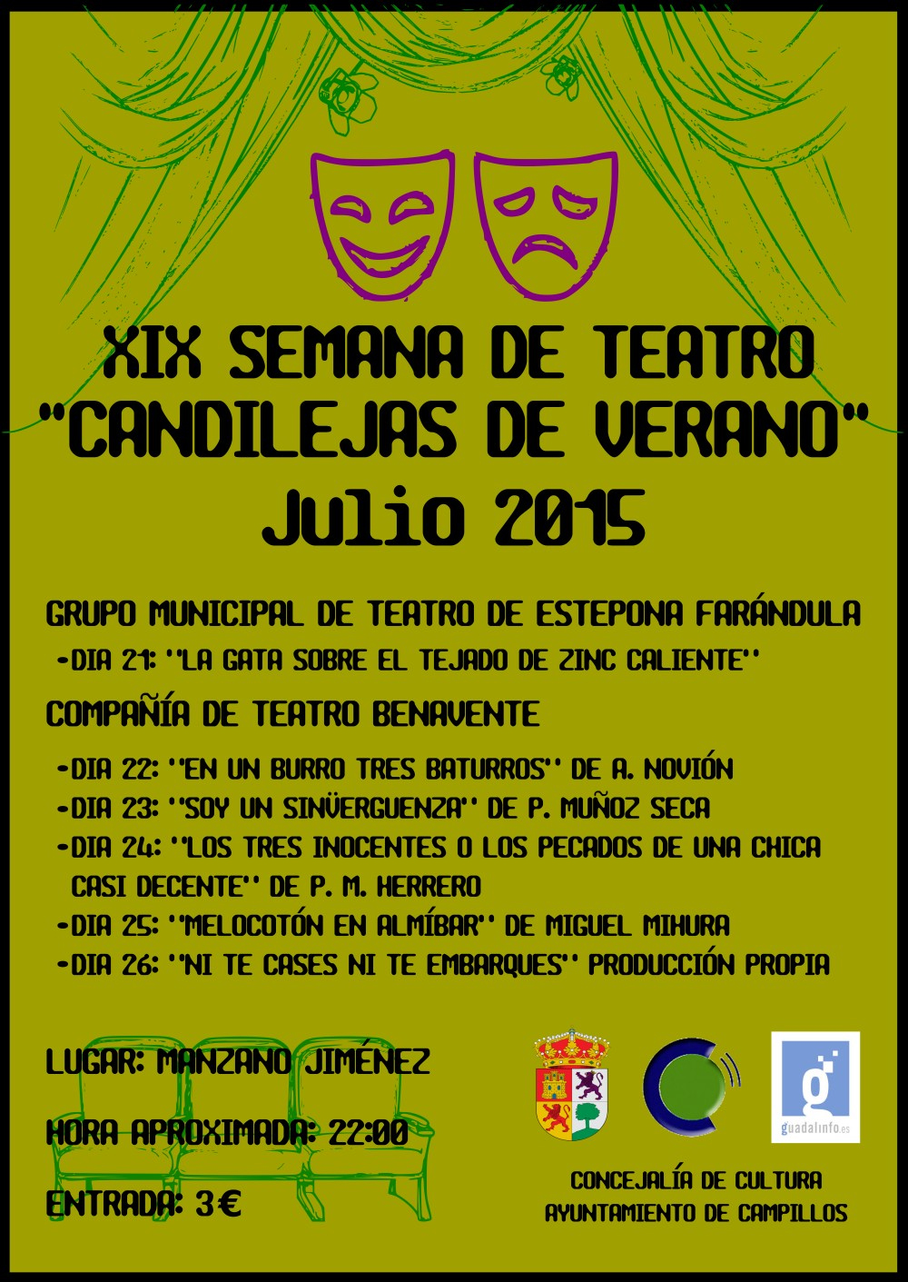 La XIX Semana de Teatro de Campillos ‘Candilejas de Verano 2015’ tendrá lugar del 21 al 26 de julio. Esto año repite la Compañía Benavente, de Madrid, que junto con el Grupo de Teatro Farándula, de Estepona, serán los encargados de actuar ante los campilleros, que como los pasados años participan de esta semana.