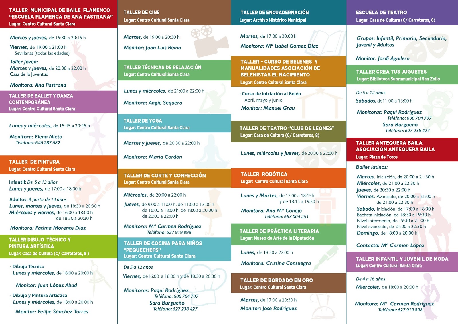El ayuntamiento de Antequera presentó ayer los talleres y escuelas municipales del curso 2015-16. Esta edición ofrece un total de 20 opciones formativas muy diferentes, dijo la concejal Ana Cebrián. En un principio eran 19, pero la reciente incorporación del taller de escritura y creación literaria hace que el número ascienda a la veintena.